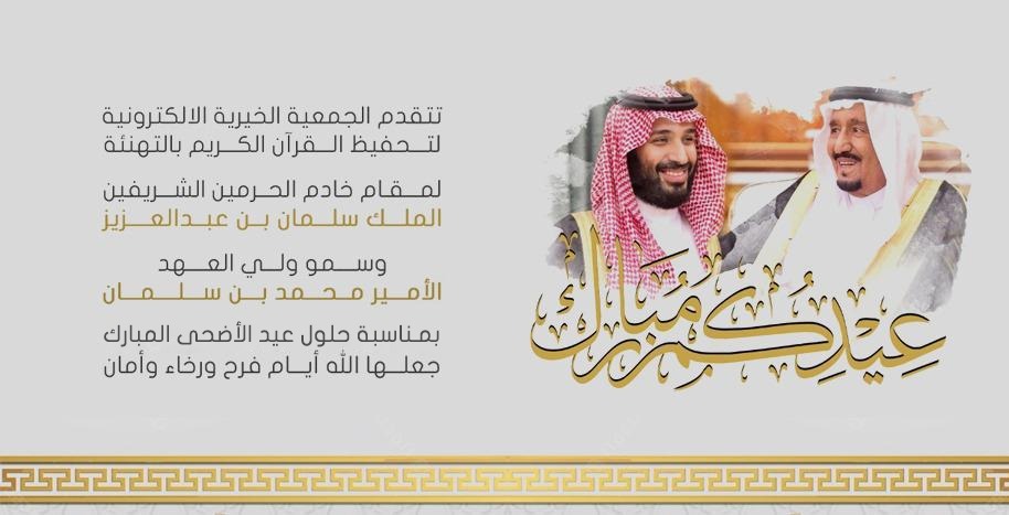 تتقدم إدارة لجمعية الخيرية الالكترونية لتحفيظ القرآن الكريم بالتهنئة لمقام : خادم الحرمين الشريفين الملك سلمان بن عبدالعزيز وسمو ولي العهد الامير محمد بن سلمان بـ عيد الاض...
