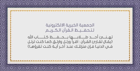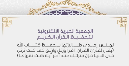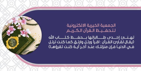 بسم الله الرحمن الرحيم تتقدم إدارة الجمعية الخيرية الإلكترونية لتحفيظ القرآن الكريم بأسمى معاني التقدير للطالبة : " عُلا عبدالسلام علي الشيخلي " رقم الطالب ( 2992110)،...