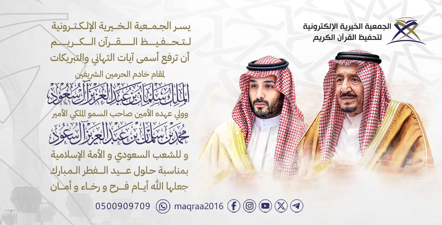 تتقدم الجمعية الخيرية الألكترونية لتحفيظ القرآن الكريم بالتهنئة: لمقام خادم الحرمين الشريفين الملك سلمان بن عبدالعزيز وسمو ولي العهد الأمير محمد بن سلمان بمناسبة حلول عيد...